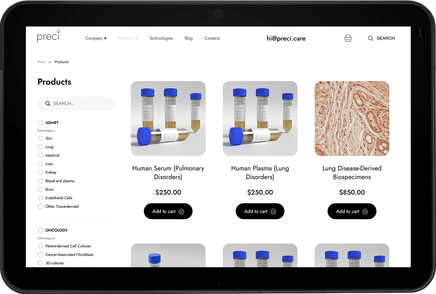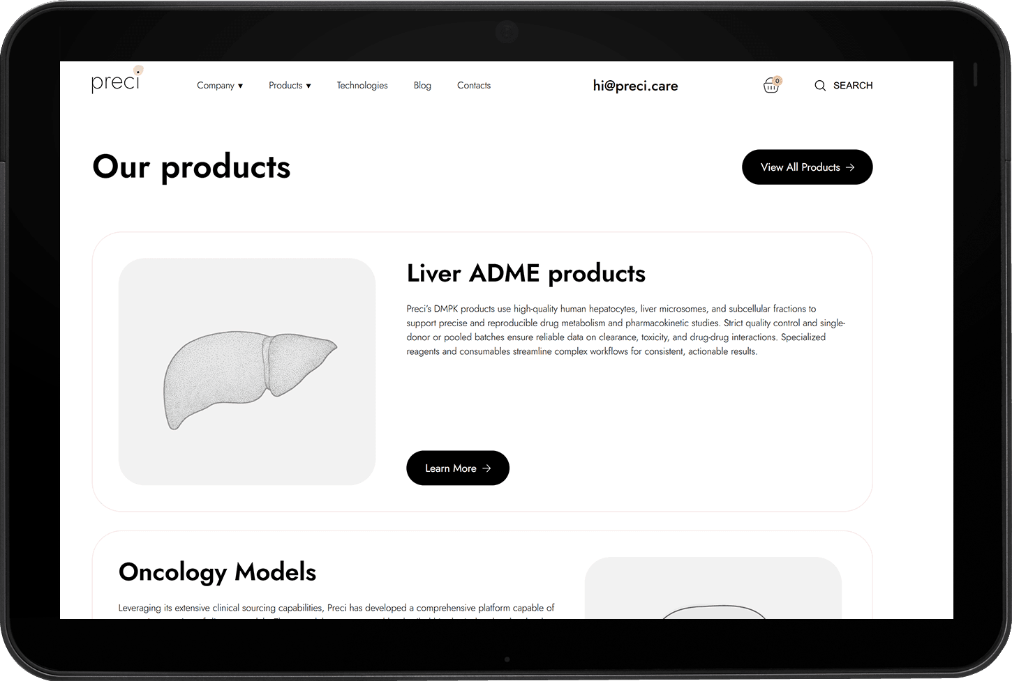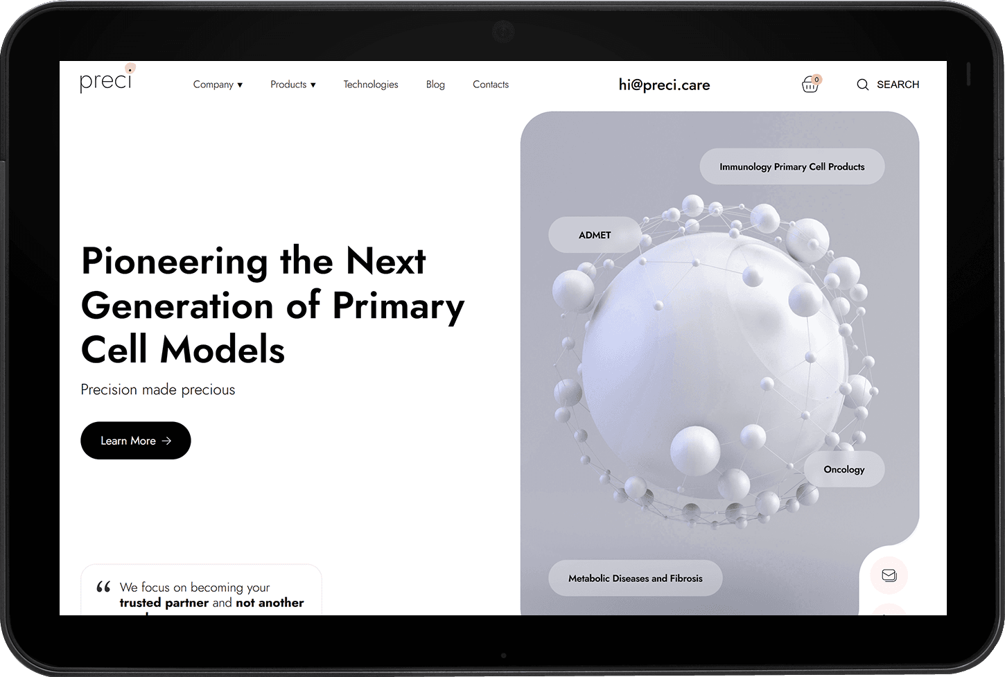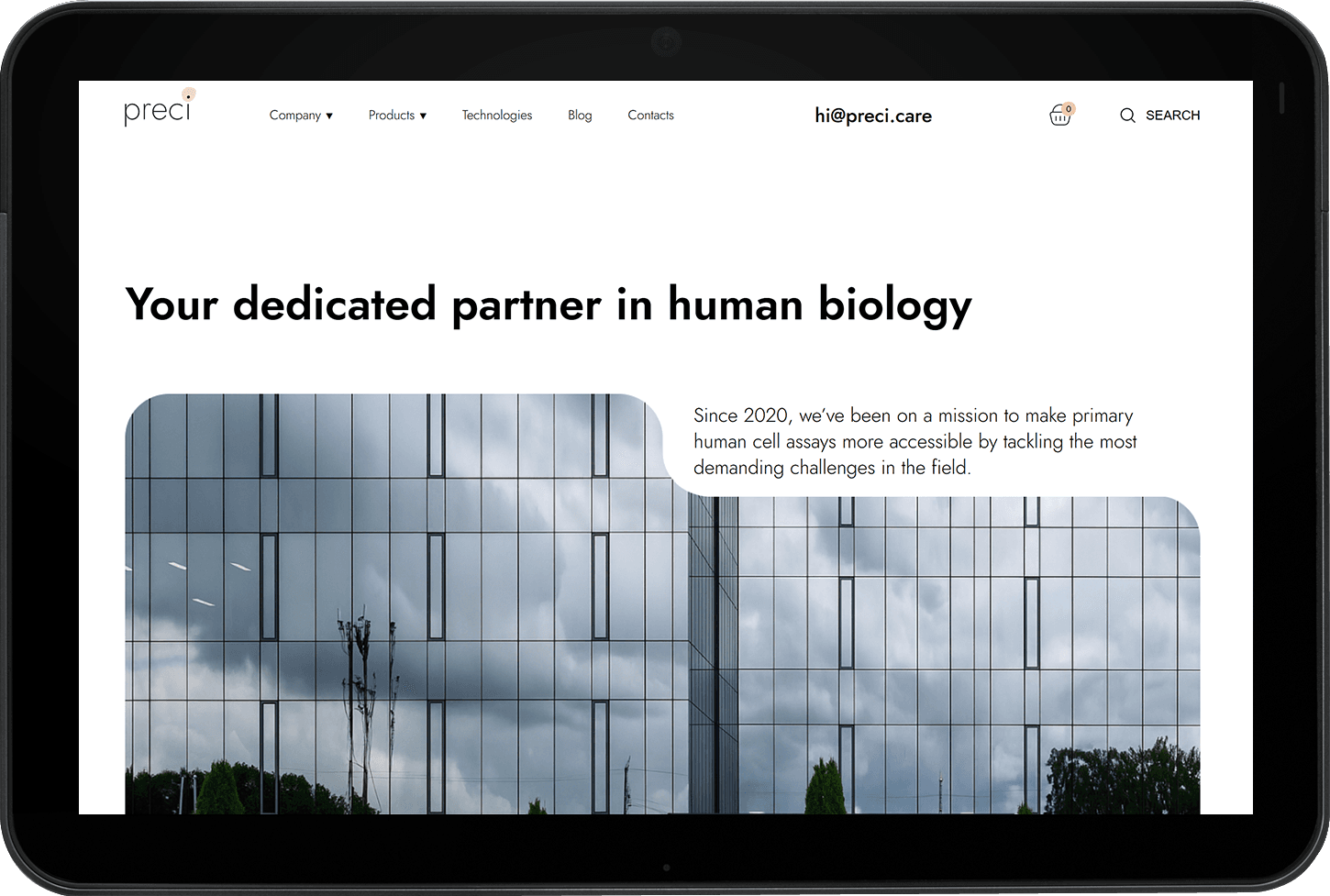 The client set the task to develop a corporate website and product catalog for the biotechnology company Preci, focusing on research products and laboratory solutions.